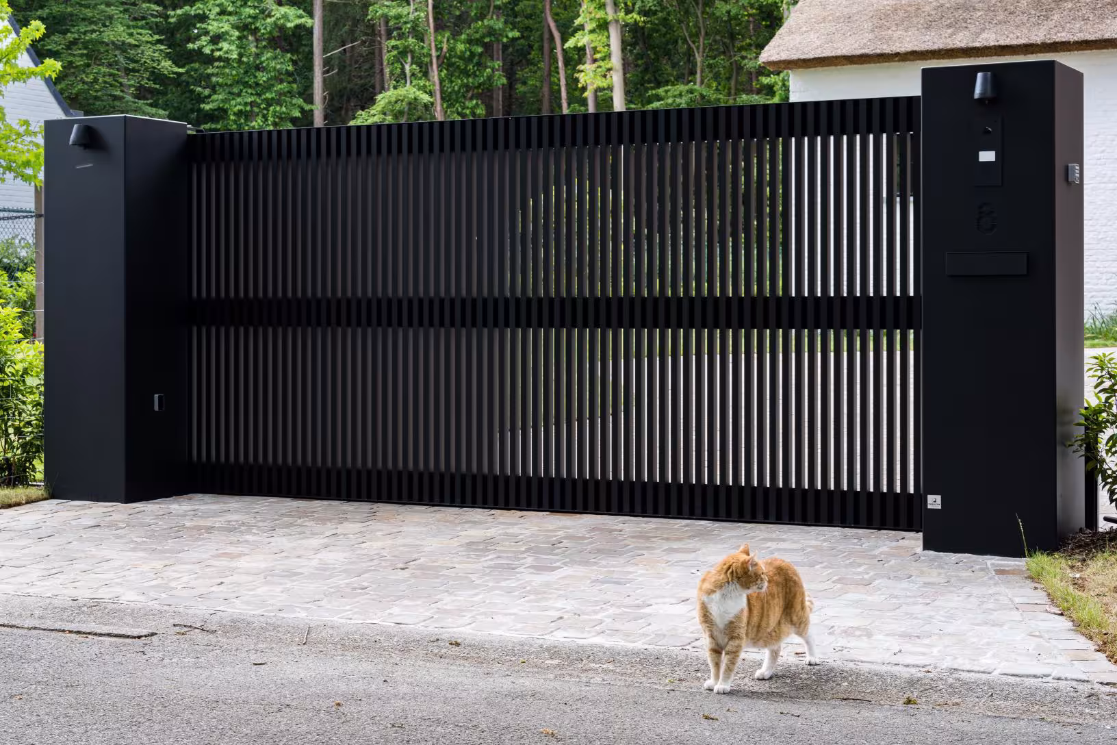 Voor deze woning realiseerde Pouleyn een maatwerk aluminium schuifpoort met een verfijnde verticale lamellenstructuur. De donkere lak en strakke belijning zorgen voor een krachtige maar elegante toegang tot het domein. De poort werd gecombineerd met een geïntegreerde brievenbus- en intercommodule.