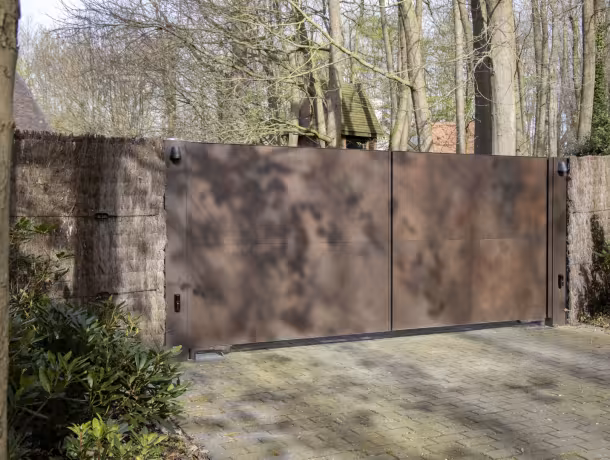 Draaipoort met keramische afwerking in warme roesttint