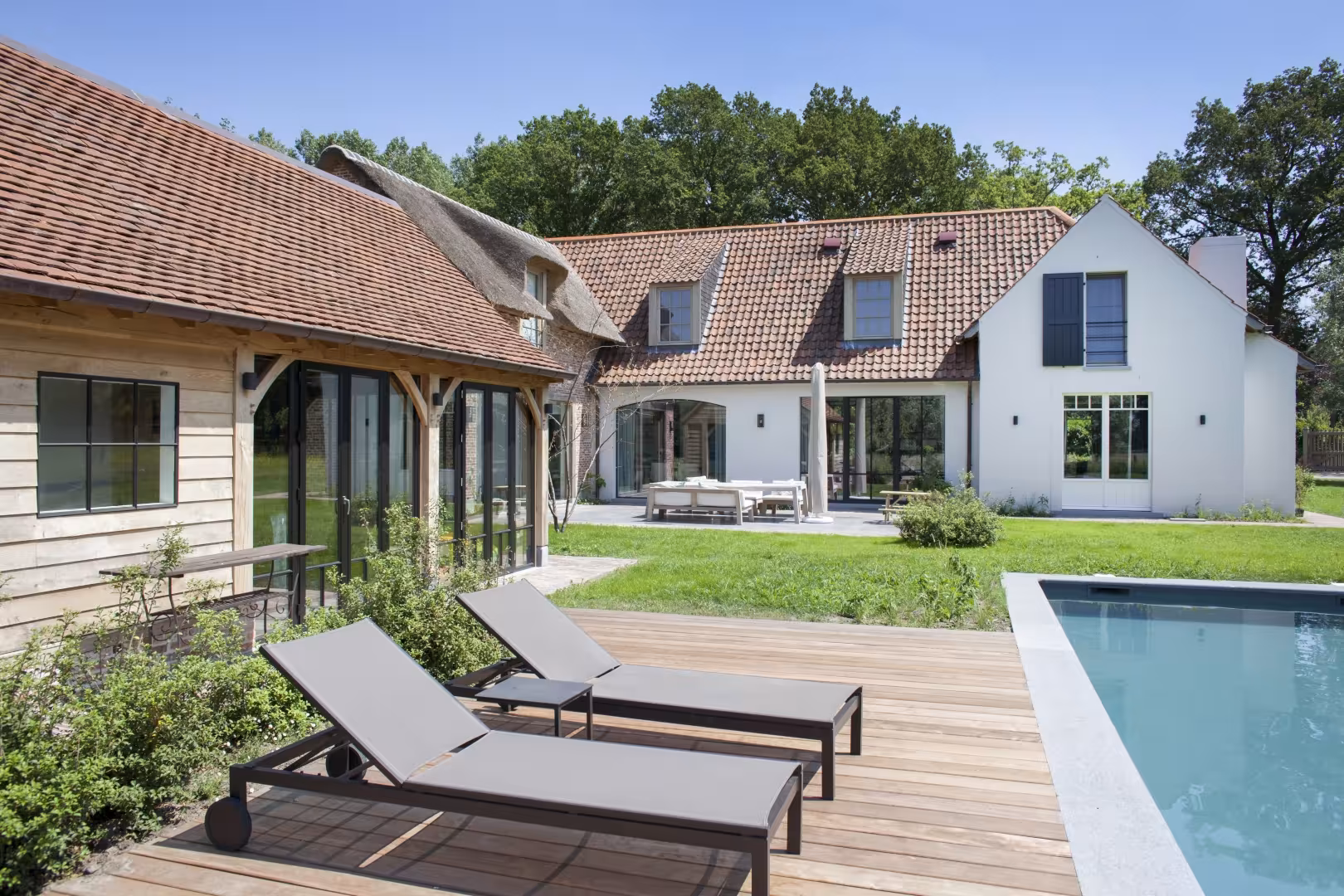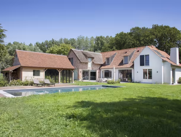 Gelakt houten buitenschrijnwerk voor een exclusieve villa met zwembad in West-Vlaanderen