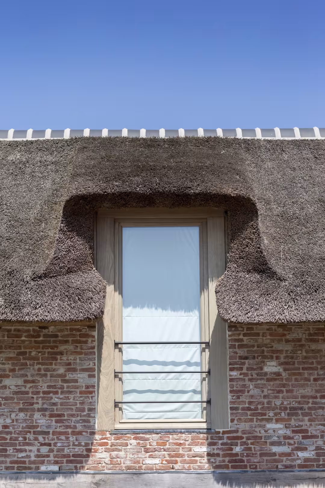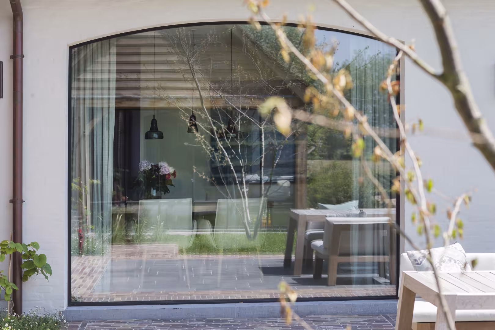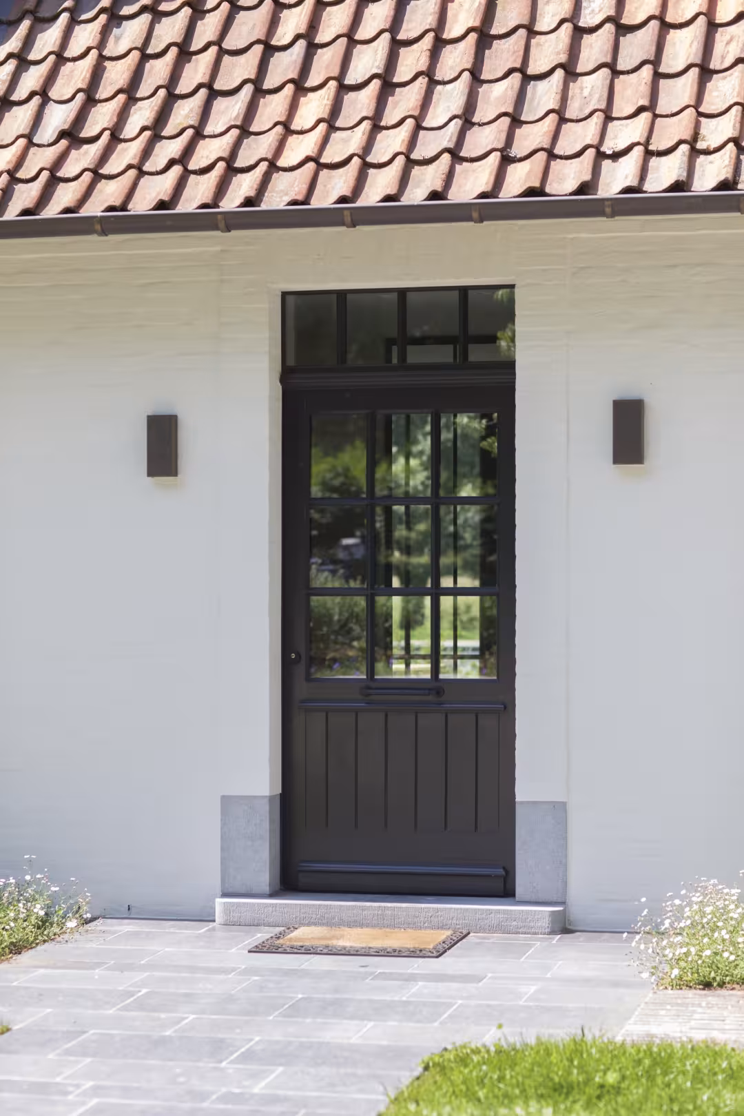 De combinatie van zachte, witgeschilderde gevels met donkere raamprofielen creëert een krachtig maar ingetogen contrast. Grote glaspartijen trekken het buitenleven naar binnen, terwijl subtiele details — zoals de verfijnde profileringen en perfect afgewerkte dorpels — het verschil maken voor wie oog heeft voor kwaliteit.