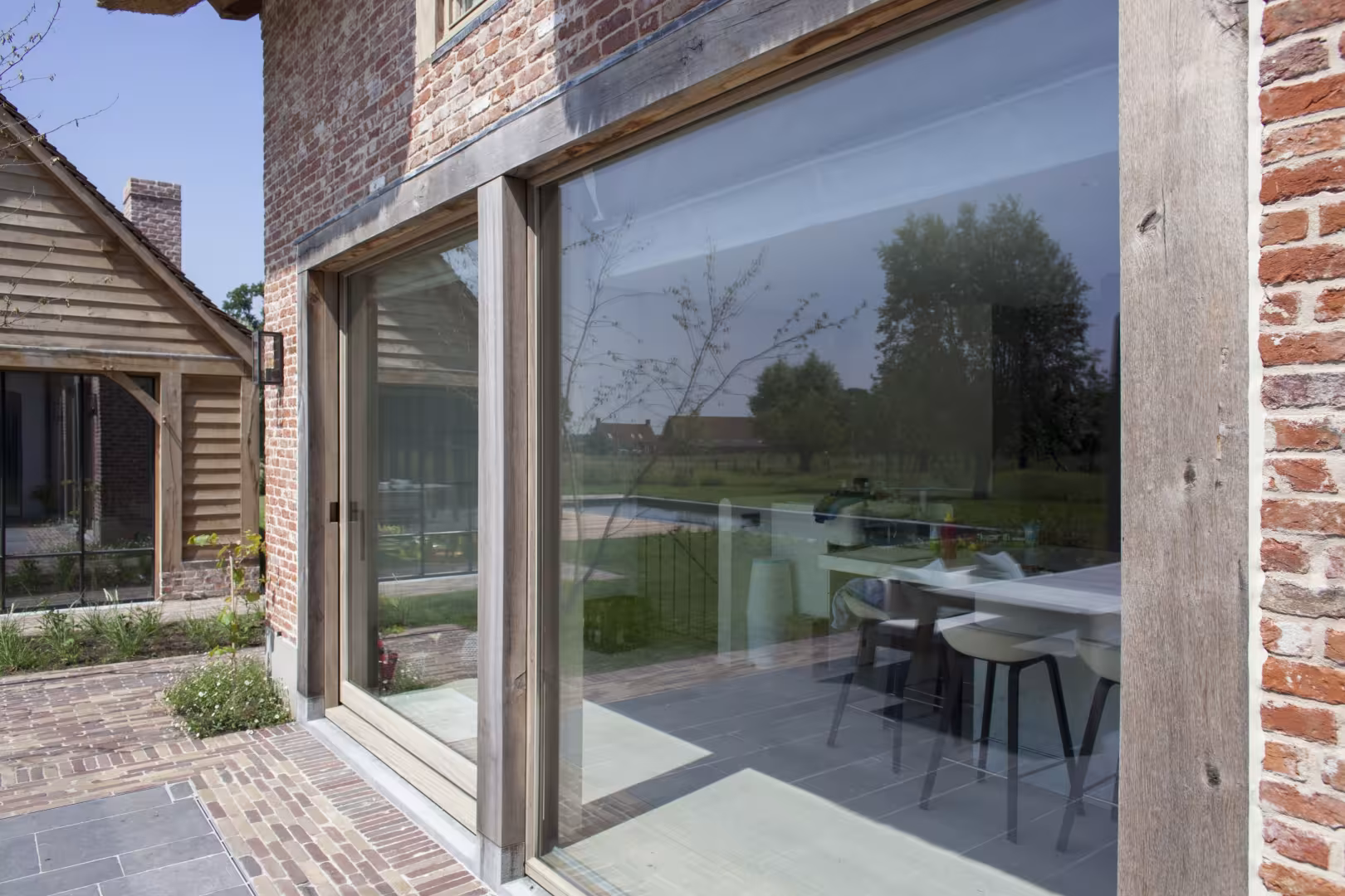 In deze exclusieve villa in West-Vlaanderen vormt gelakt houten buitenschrijnwerk de verbindende factor tussen architectuur en omgeving.