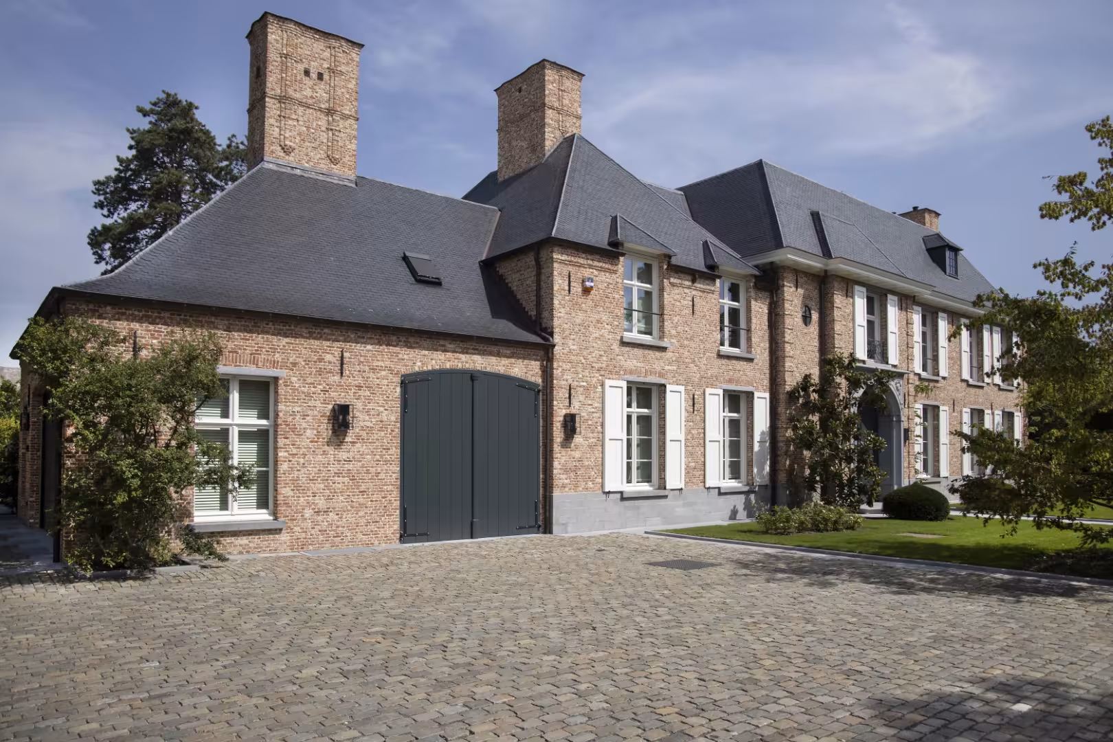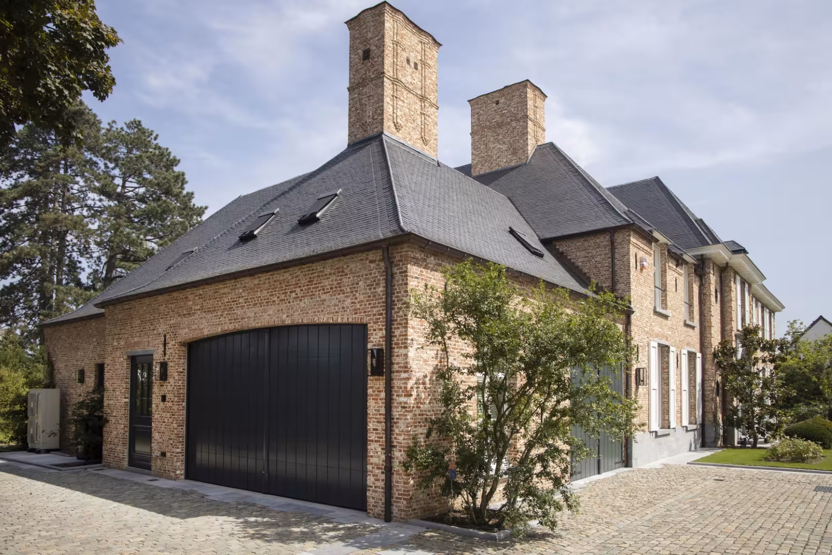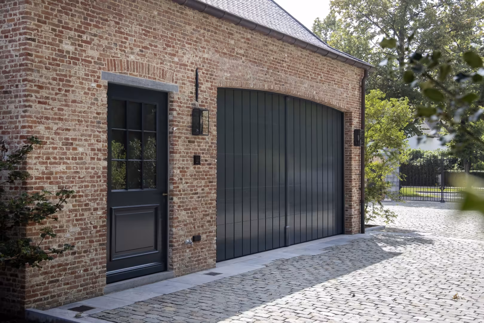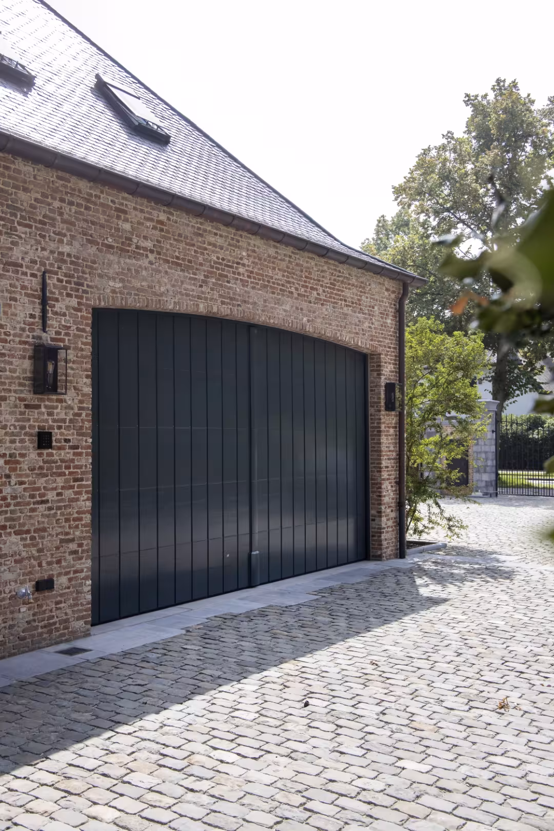 Voor deze woning werd gekozen voor een sectionaalpoort in hout, afgewerkt met een diepe, donkere lak. De poort volgt de gebogen vorm van de garageopening en sluit visueel aan bij het metselwerk en de andere buitenelementen. Het geheel oogt strak en rustig, zonder overbodige accenten.