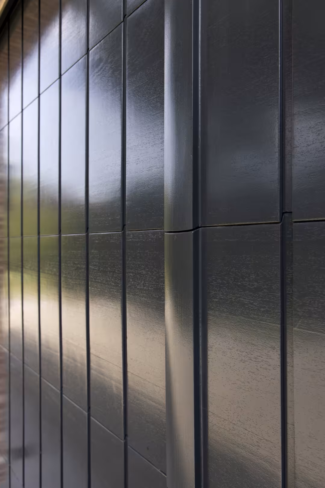 De verticale profilering geeft de poort een duidelijke structuur, terwijl de egale laklaag zorgt voor een hedendaagse uitstraling. In gesloten toestand vormt de poort één vlak geheel.