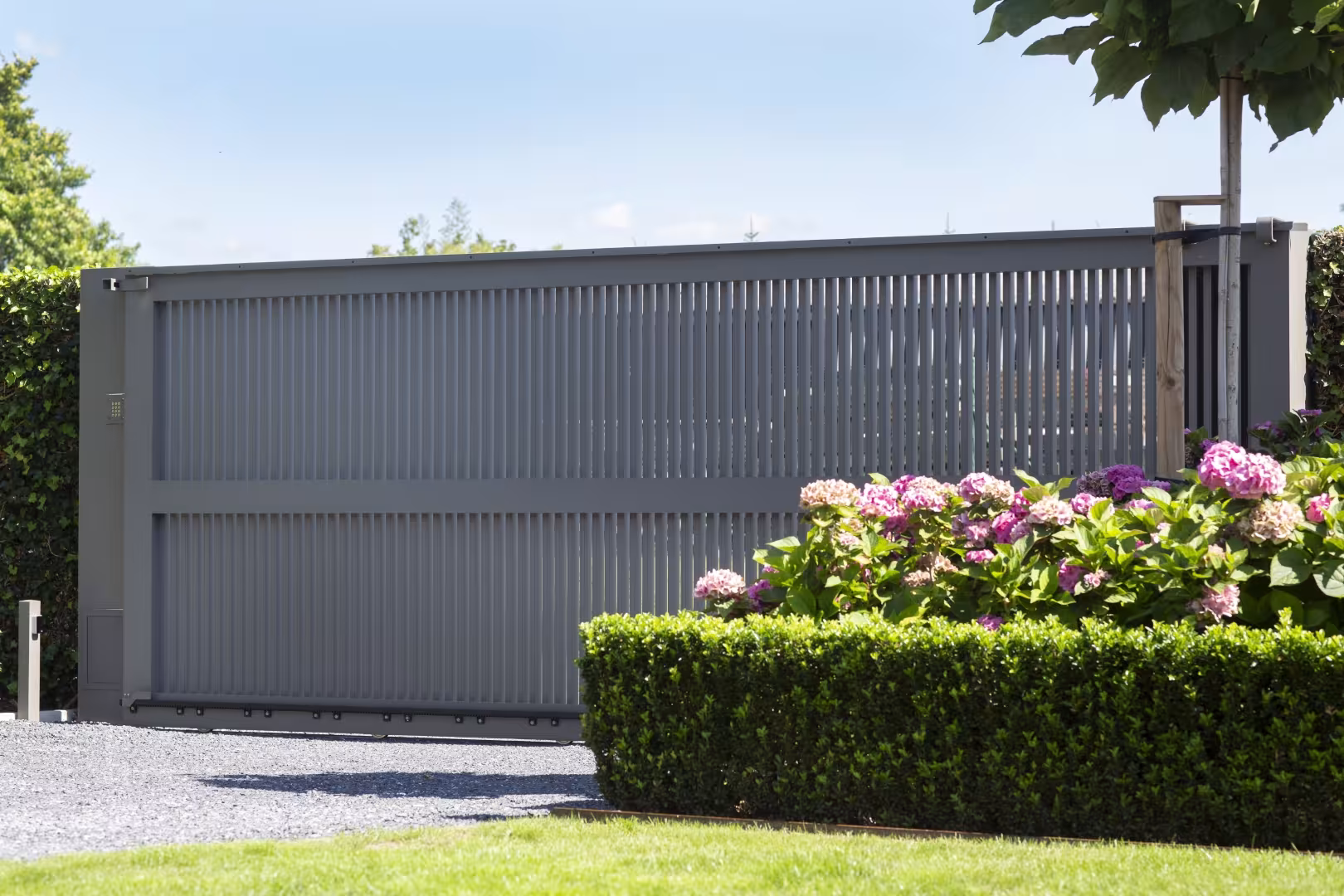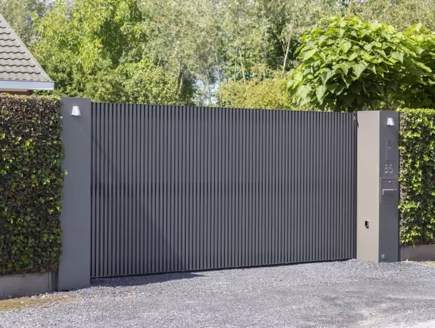 Een strakke toegang die rust brengt in het geheel. Deze aluminium schuifpoort met fijne verticale latjes speelt subtiel met licht en zicht, waardoor de woning afgeschermd blijft zonder volledig afgesloten te ogen. De zachte grijstint sluit perfect aan bij de architectuur en het groen rondom, wat zorgt voor een harmonieus straatbeeld.