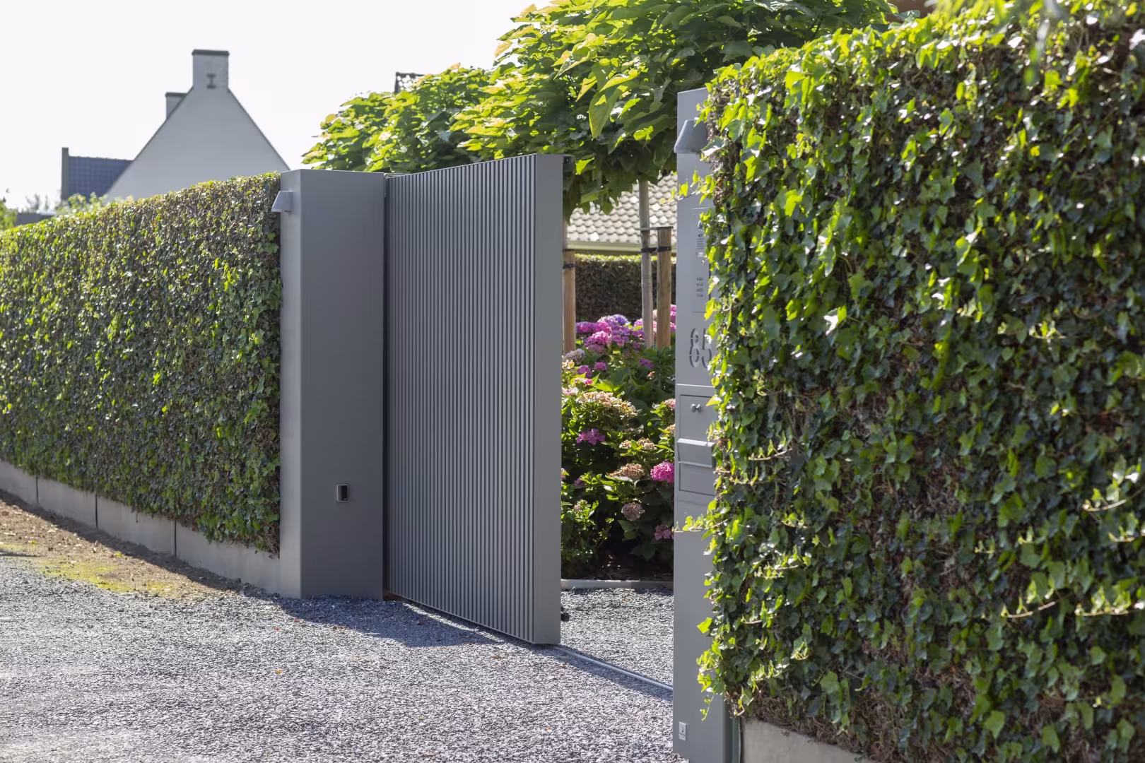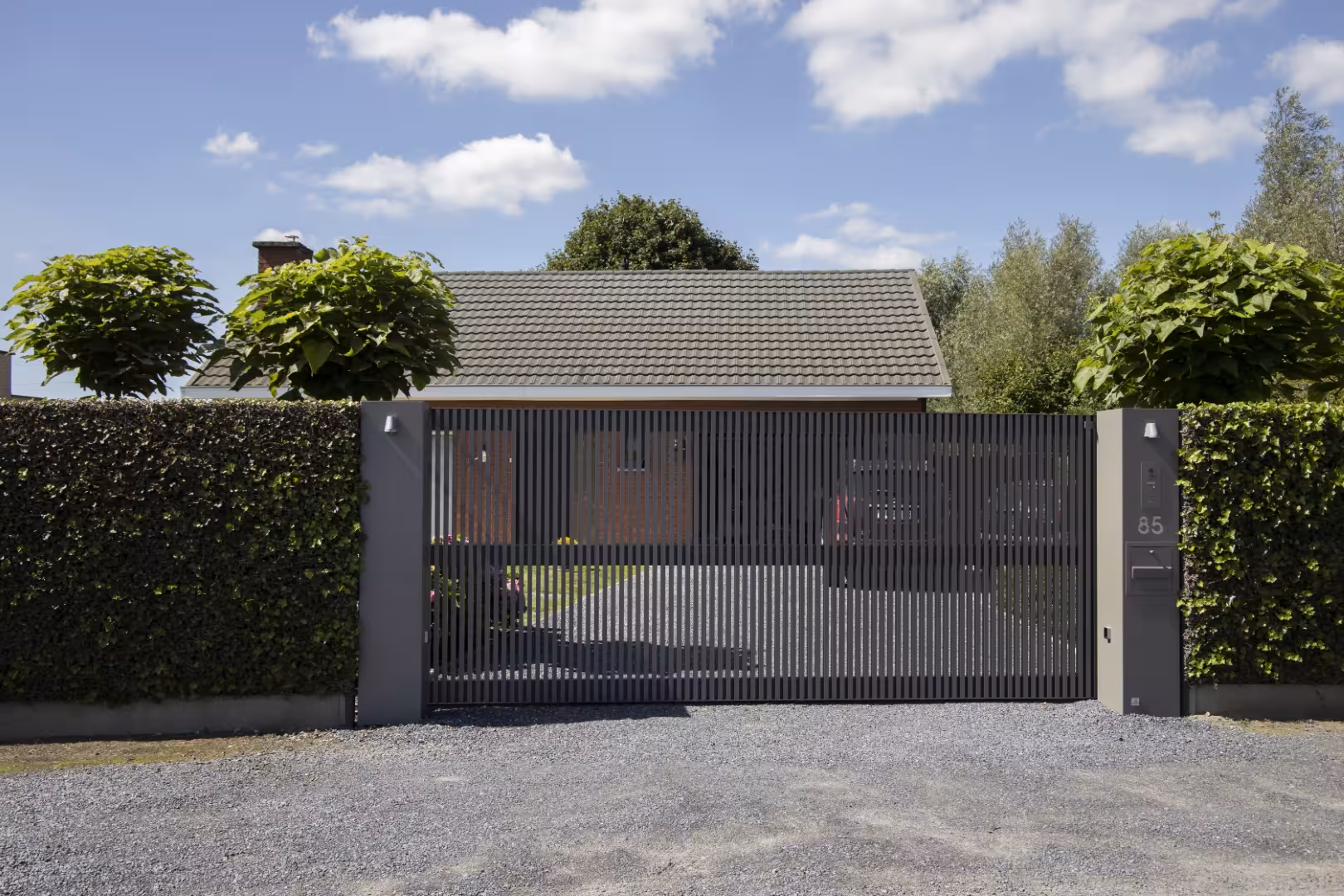 De poort is volledig geautomatiseerd en schuift vlot open langs de zijkant, zonder in te boeten op ruimte vooraan. De geïntegreerde kolommen met parlofoon, huisnummer en brievenbus zorgen voor een heldere, praktische indeling aan de straatzijde.