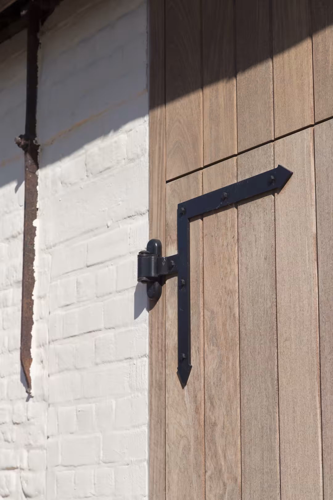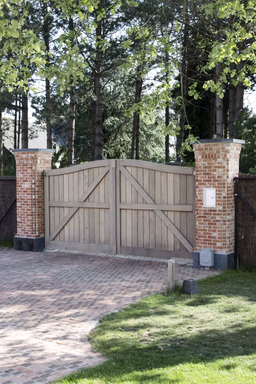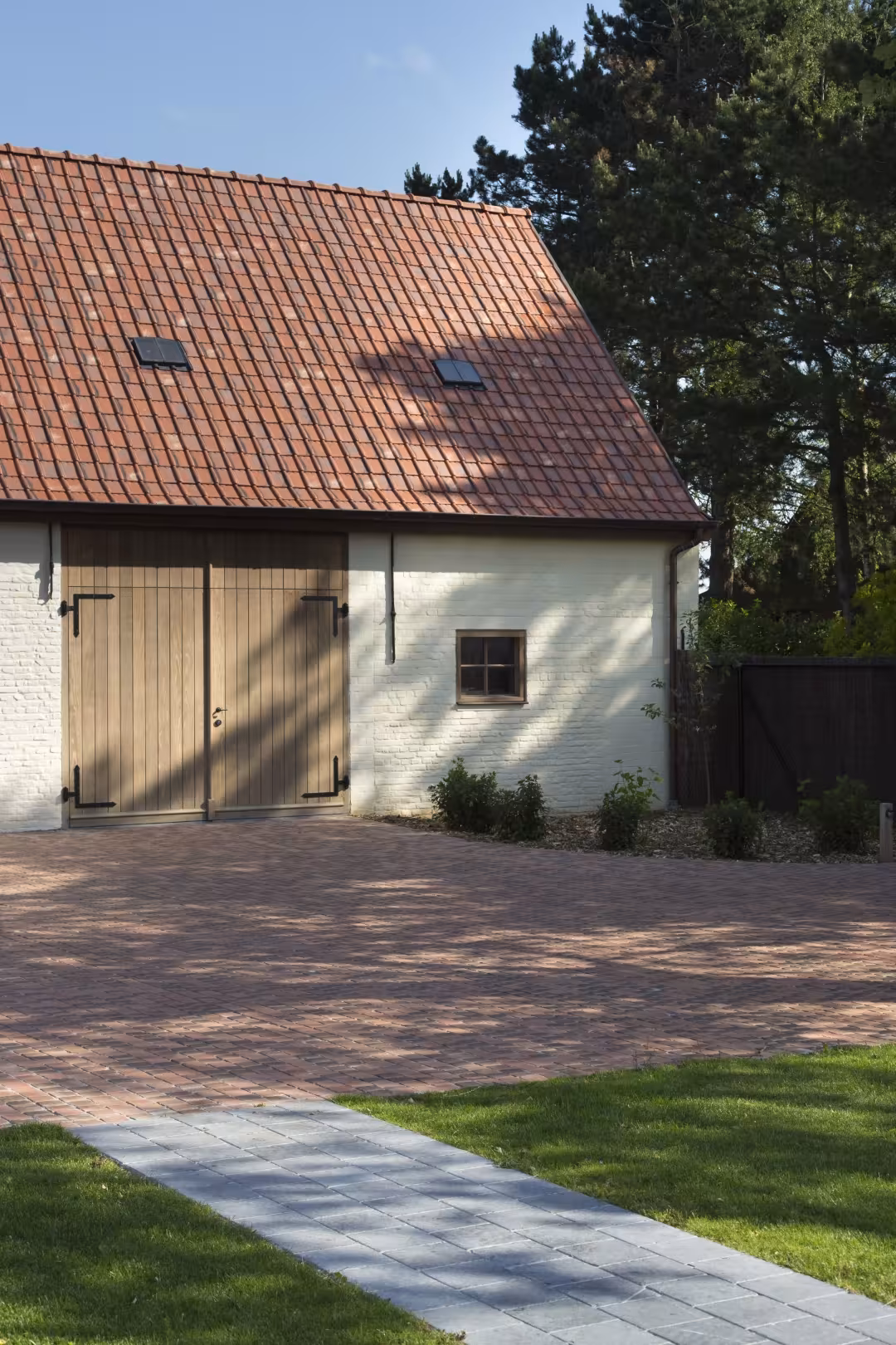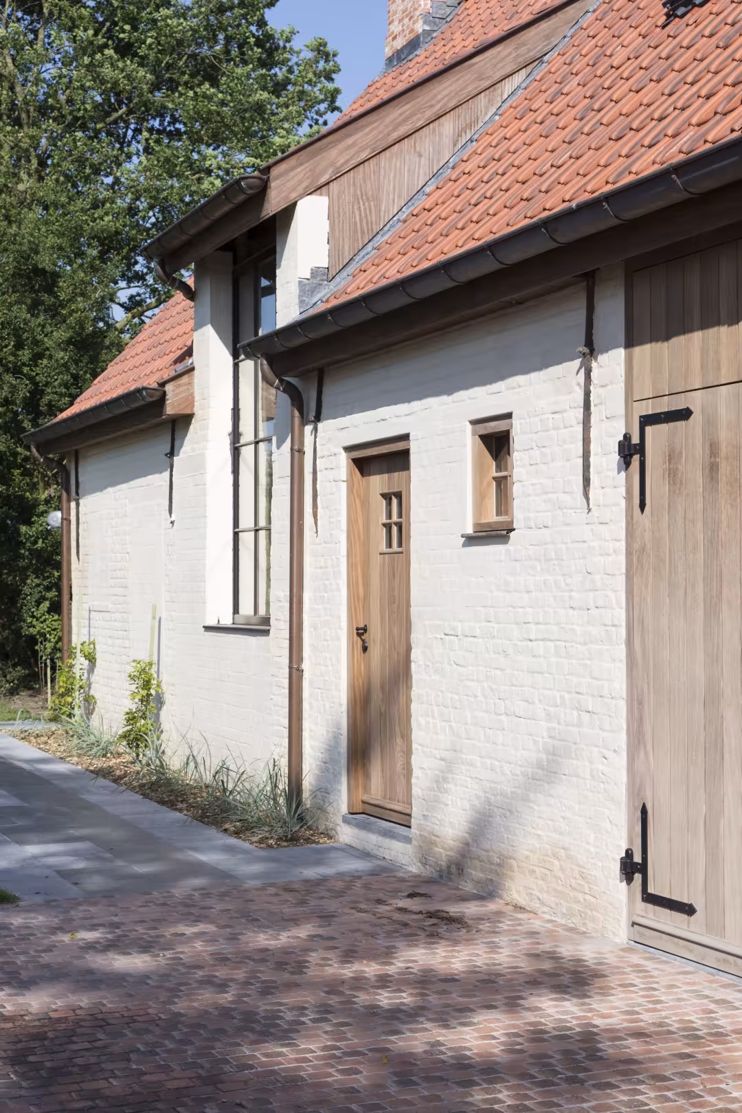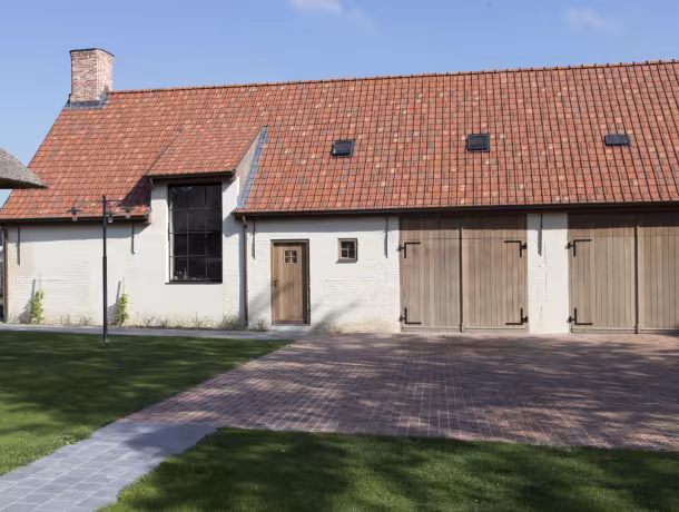 In Sleidinge werd deze landelijke woning afgewerkt met hoevepoorten in naturel Afrormosia. De combinatie van wit geschilderde gevels, rode dakpannen en warm hout zorgt voor een evenwichtig geheel. De poorten sluiten visueel aan op de architectuur en versterken het karakter van de woning zonder te domineren.