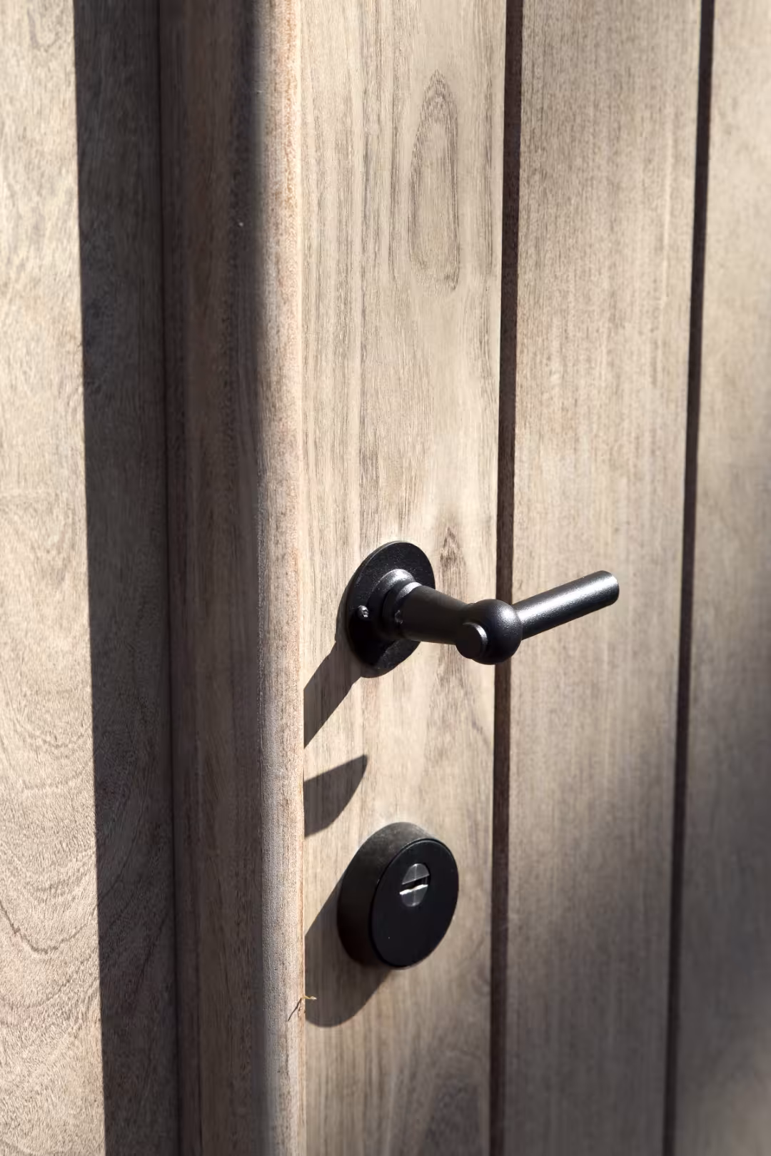 Afrormosia werd hier gekozen omwille van zijn stabiliteit en natuurlijke veroudering, waardoor de poorten hun uitstraling behouden doorheen de jaren.