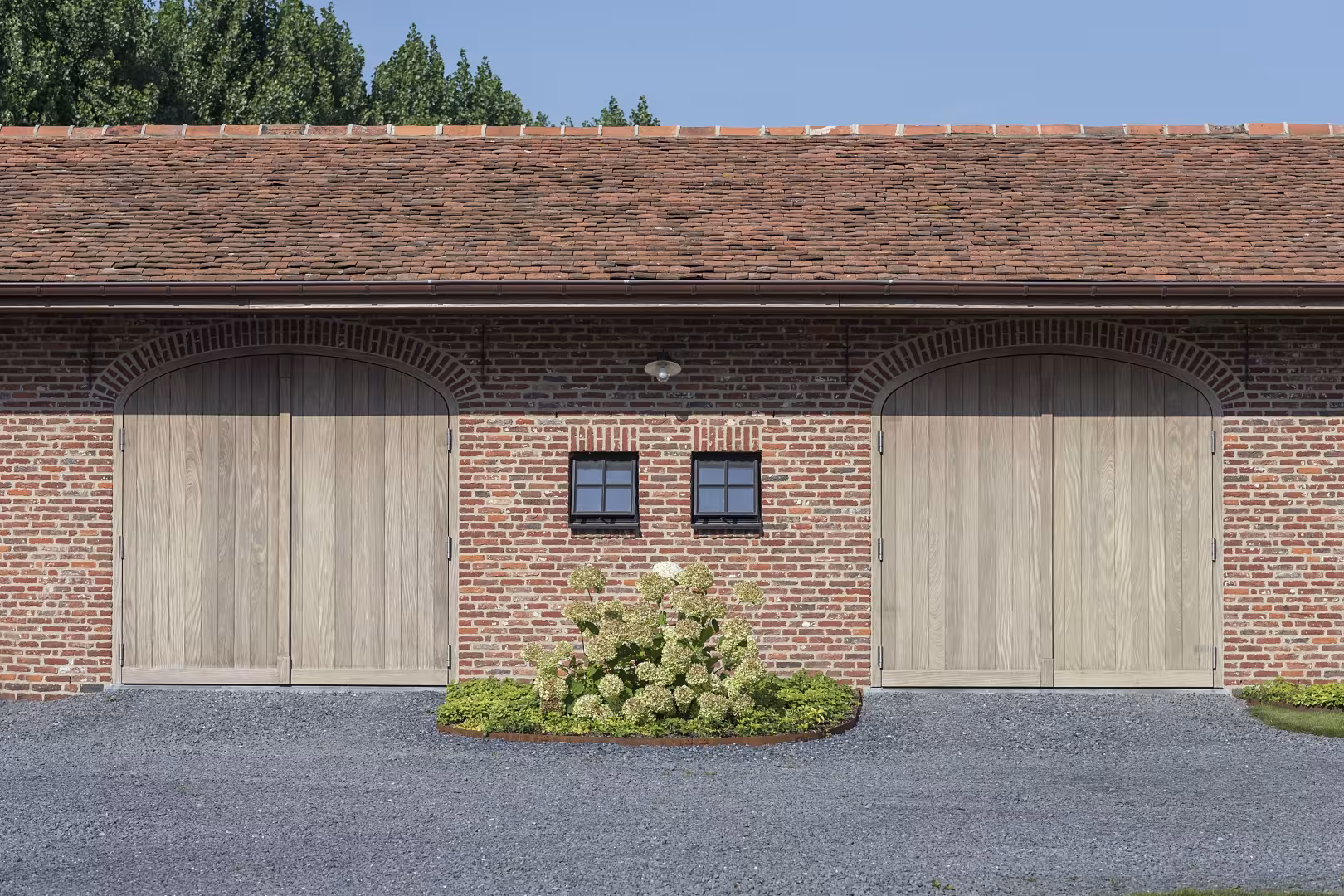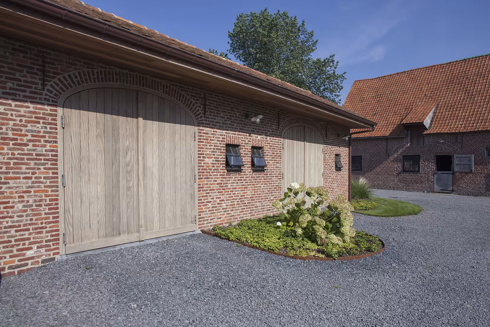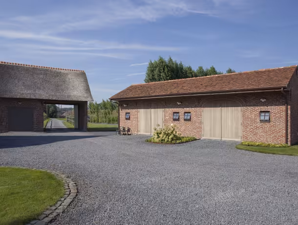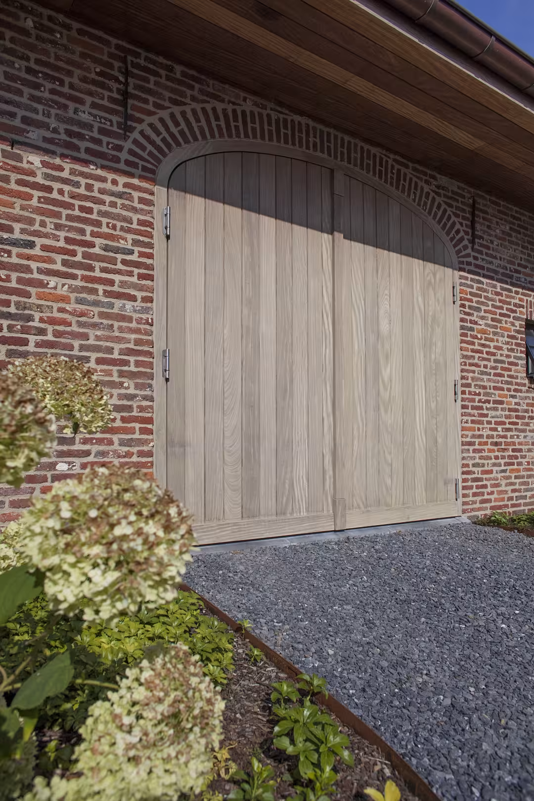 Voor dit project werden meerdere hoevepoorten in Afrormosia geïntegreerd in een landelijke architectuur met gemetste bogen. De warme houtkleur contrasteert subtiel met de rode gevelsteen en versterkt het authentieke karakter van het geheel. Door de herhaling van de poorten ontstaat een rustig en krachtig gevelbeeld.