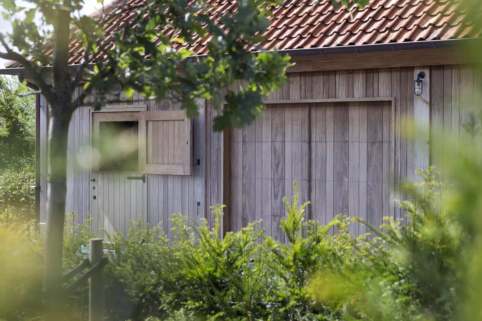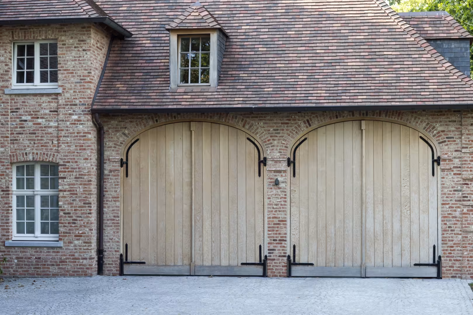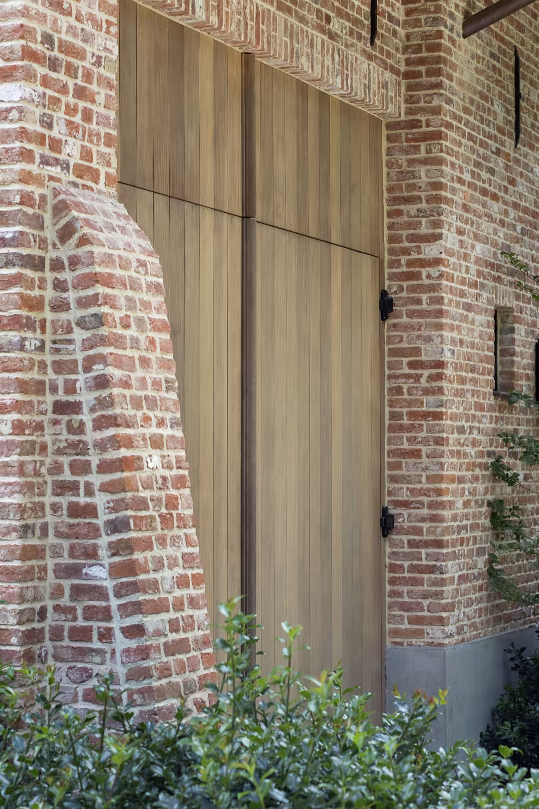 Voor dit project werden meerdere hoevepoorten in Afrormosia geïntegreerd in een landelijke architectuur met gemetste bogen. De warme houtkleur contrasteert subtiel met de rode gevelsteen en versterkt het authentieke karakter van het geheel. Door de herhaling van de poorten ontstaat een rustig en krachtig gevelbeeld.