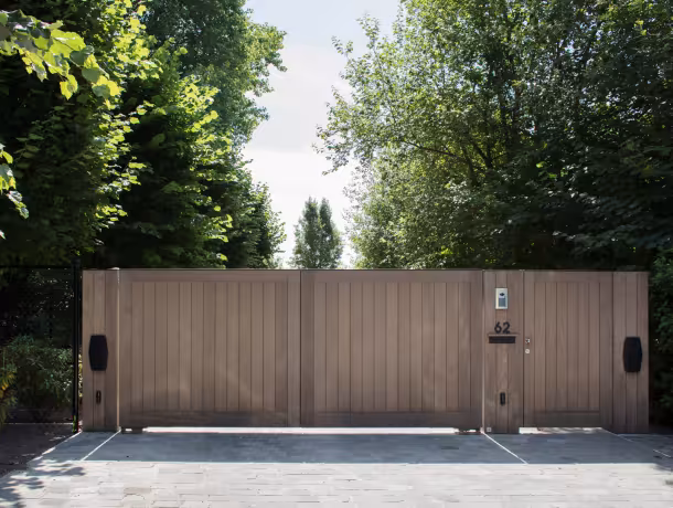 Een oplossing die niet alleen afsluit, maar ook verwelkomt — en die perfect past binnen een high-end tuinconcept waar materiaal, proportie en afwerking naadloos op elkaar zijn afgestemd.