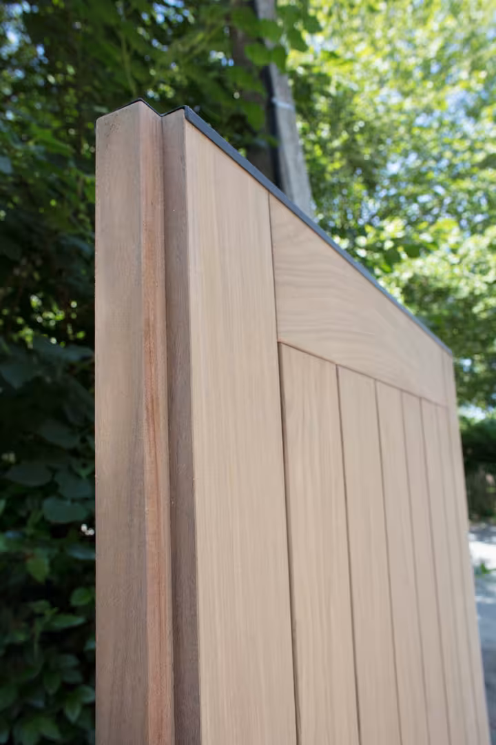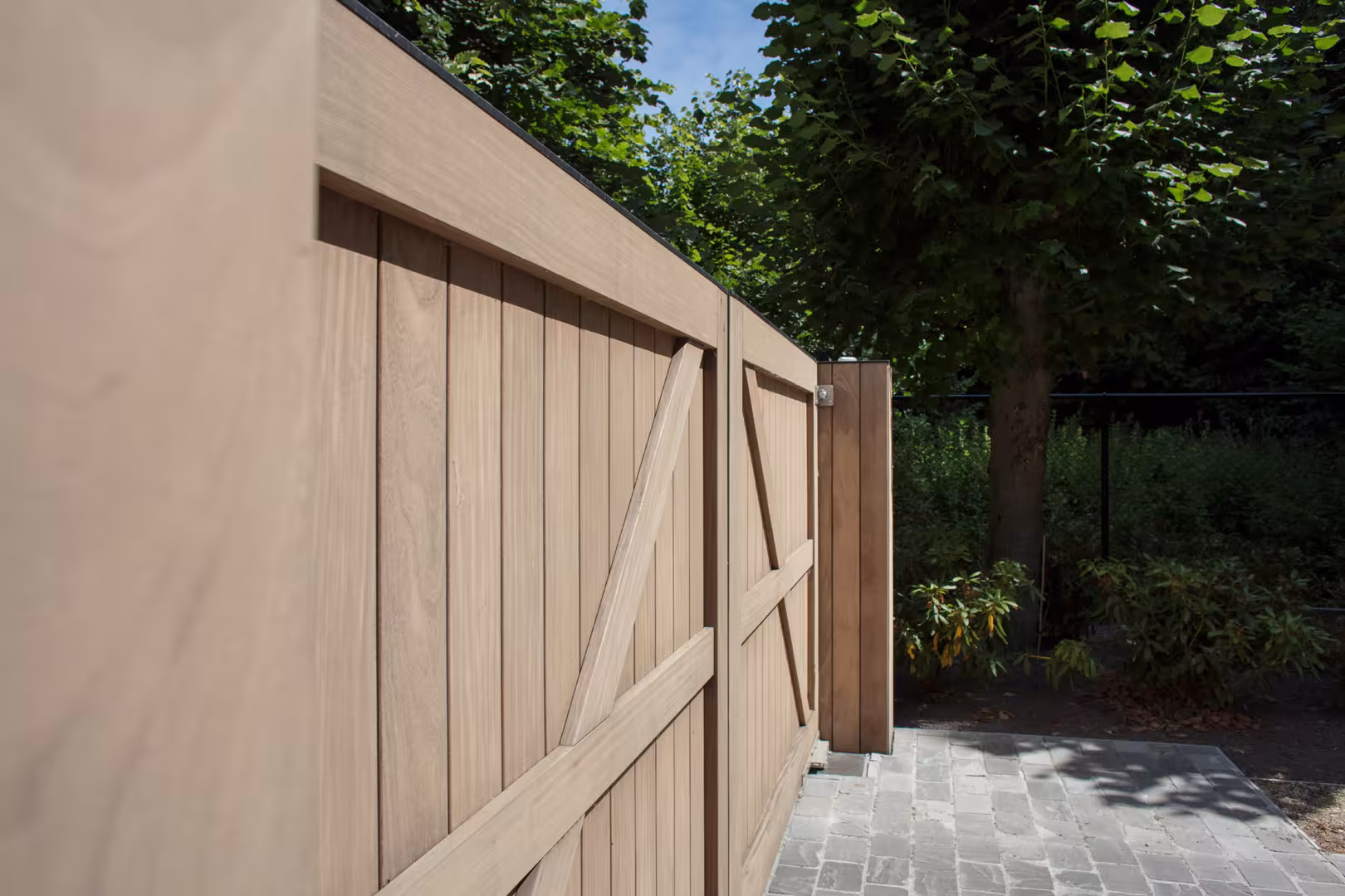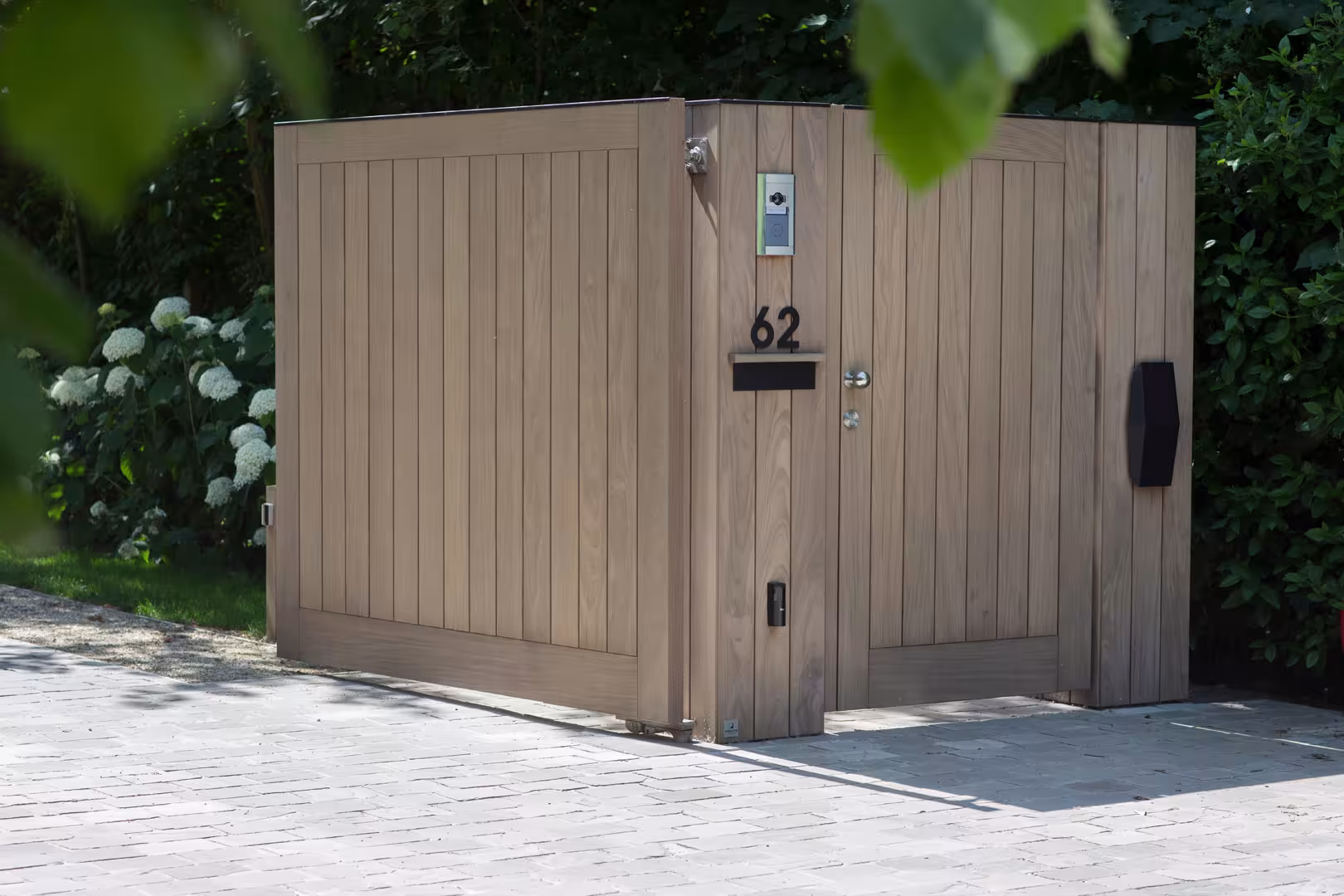 In deze realisatie in regio Vurste staat een houten draaipoort centraal die rust en verfijning brengt aan de volledige voortuin. De strakke belijning, gecombineerd met het warme karakter van Afrormosia, zorgt voor een tijdloze toegang die perfect aansluit bij een groene, residentiële omgeving. Subtiel geïntegreerde elementen zoals de brievenbus, parlofoon en huisnummer versterken het totaalbeeld zonder de esthetiek te verstoren.