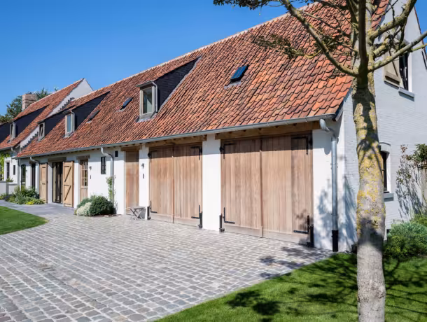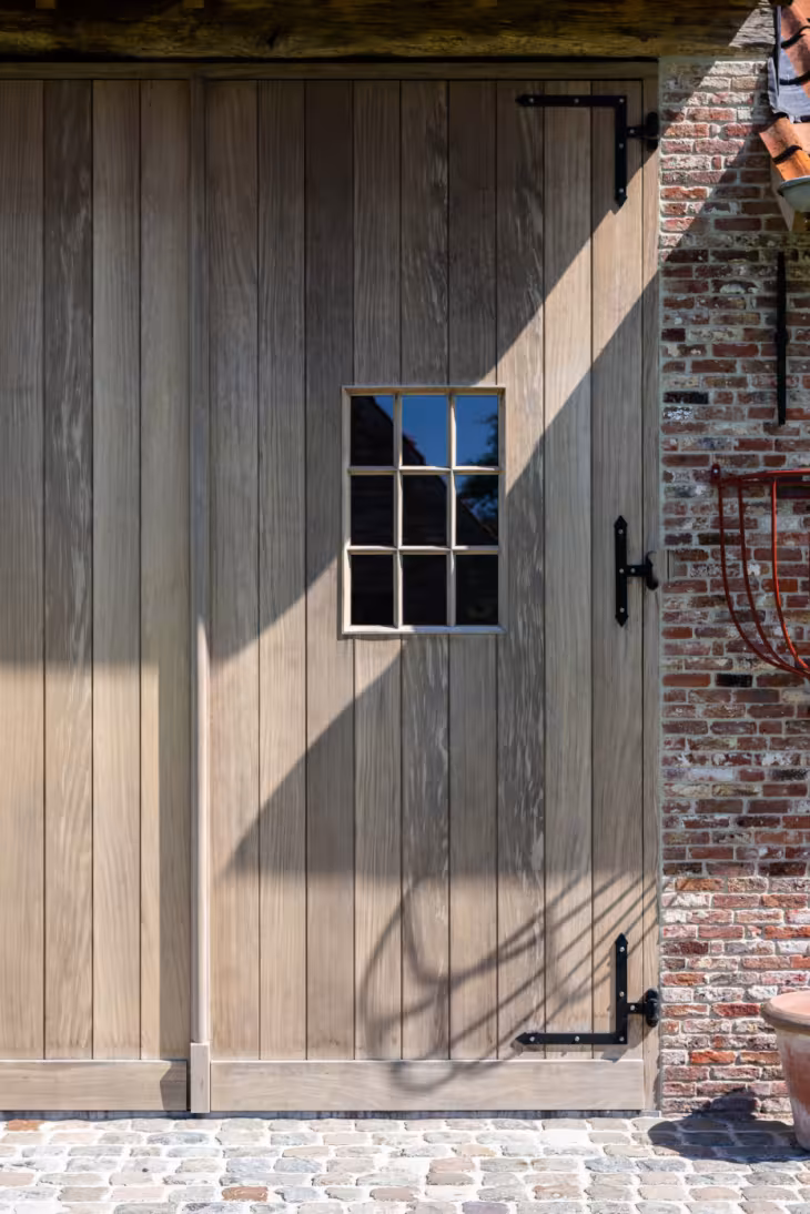 De keuze voor houten hoevepoorten is hier allesbehalve toevallig. In een architectuur waar authenticiteit centraal staat, vraagt elk detail om consistentie. Hout brengt die natuurlijke zachtheid en diepte die aluminium of staal eenvoudigweg niet kunnen evenaren.