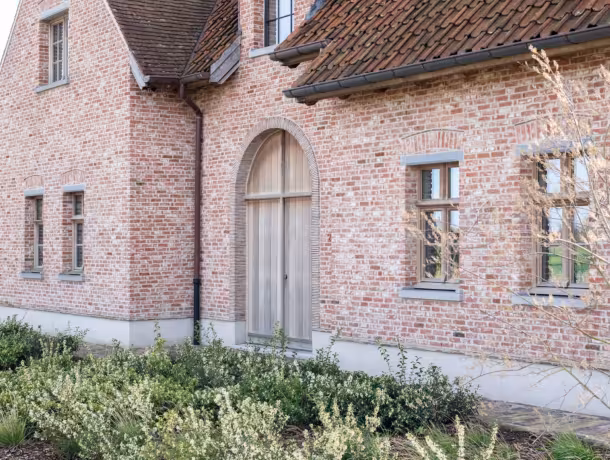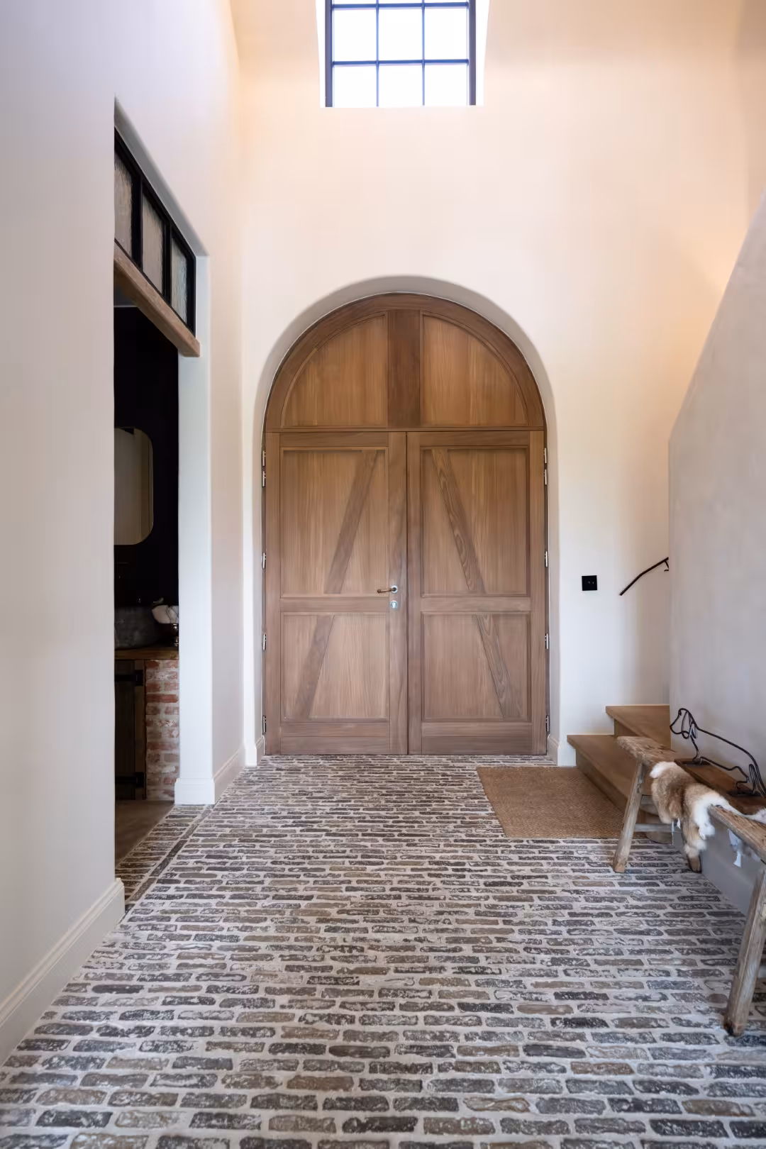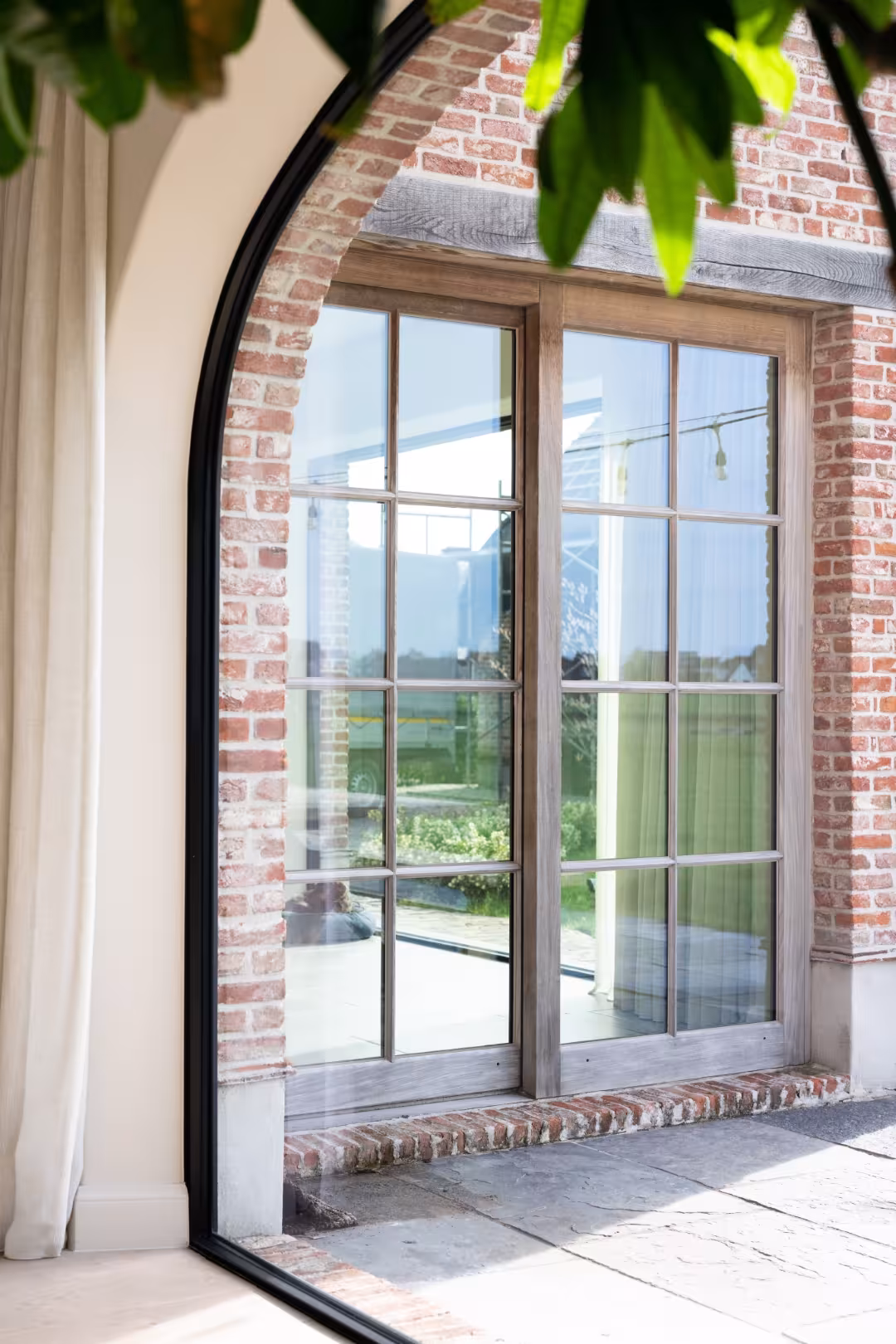 Het project wordt gekenmerkt door maatwerk in hout, waarbij ramen en deuren naadloos aansluiten op de architectuur van de woning. Opvallend zijn de boogvormige raamopeningen en de robuuste houten inkomdeur, die verwijzen naar klassieke hoevestijl, terwijl de slanke profielen en grote glasoppervlakken zorgen voor een moderne toets. Binnen en buiten vloeien visueel in elkaar over dankzij strategisch geplaatste raampartijen en doorgangen, waardoor het natuurlijke licht maximaal wordt benut. De keuze voor warme houttinten versterkt het tijdloze karakter en maakt dit schrijnwerk tot een essentieel onderdeel van de totale woonbeleving.