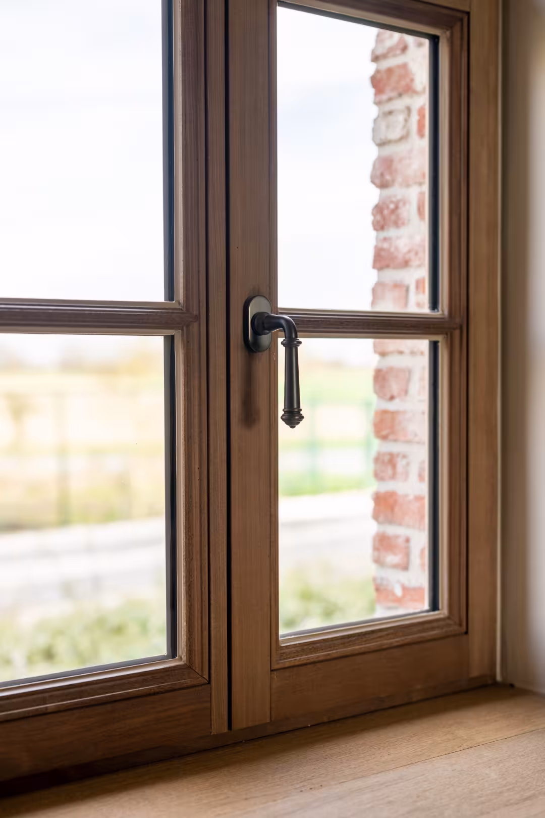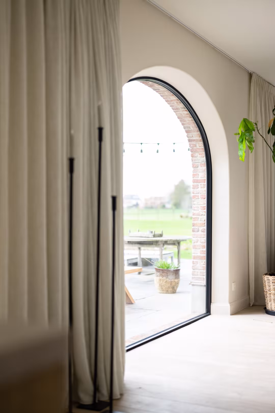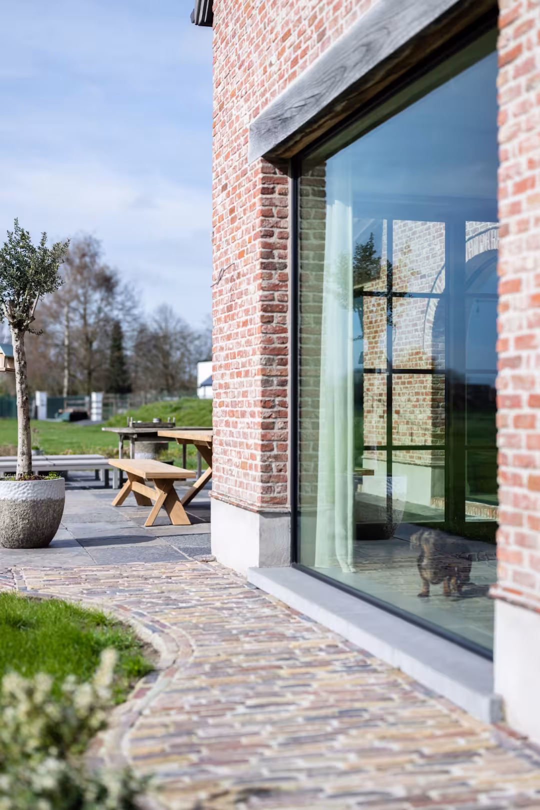 Het project wordt gekenmerkt door maatwerk in hout, waarbij ramen en deuren naadloos aansluiten op de architectuur van de woning. Opvallend zijn de boogvormige raamopeningen en de robuuste houten inkomdeur, die verwijzen naar klassieke hoevestijl, terwijl de slanke profielen en grote glasoppervlakken zorgen voor een moderne toets. Binnen en buiten vloeien visueel in elkaar over dankzij strategisch geplaatste raampartijen en doorgangen, waardoor het natuurlijke licht maximaal wordt benut. De keuze voor warme houttinten versterkt het tijdloze karakter en maakt dit schrijnwerk tot een essentieel onderdeel van de totale woonbeleving.
