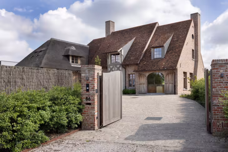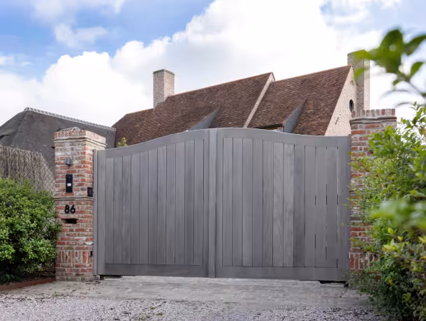 Voor dit poortproject werd gekozen voor een houten tuinpoort in Afrormosia, een tropische hardhoutsoort die bekend staat om zijn uitzonderlijke duurzaamheid en stabiliteit. De poort is volledig op maat vervaardigd en voorzien van een dubbele draaivleugel met automatische bediening, waardoor comfort en gebruiksgemak centraal staan. De natuurlijke afwerking zorgt ervoor dat het hout mooi egaal vergrijst, zonder in te boeten op kwaliteit. Dankzij de stevige constructie, hoogwaardige scharnieren en integratie met parlofoon en automatisatie is deze tuinpoort niet alleen een esthetische meerwaarde, maar ook een veilige en praktische toegang tot het perceel. Ideaal voor wie op zoek is naar een houten toegangspoort die jarenlang meegaat en perfect aansluit bij een landelijke of klassieke woning.
