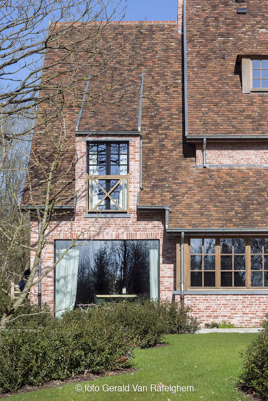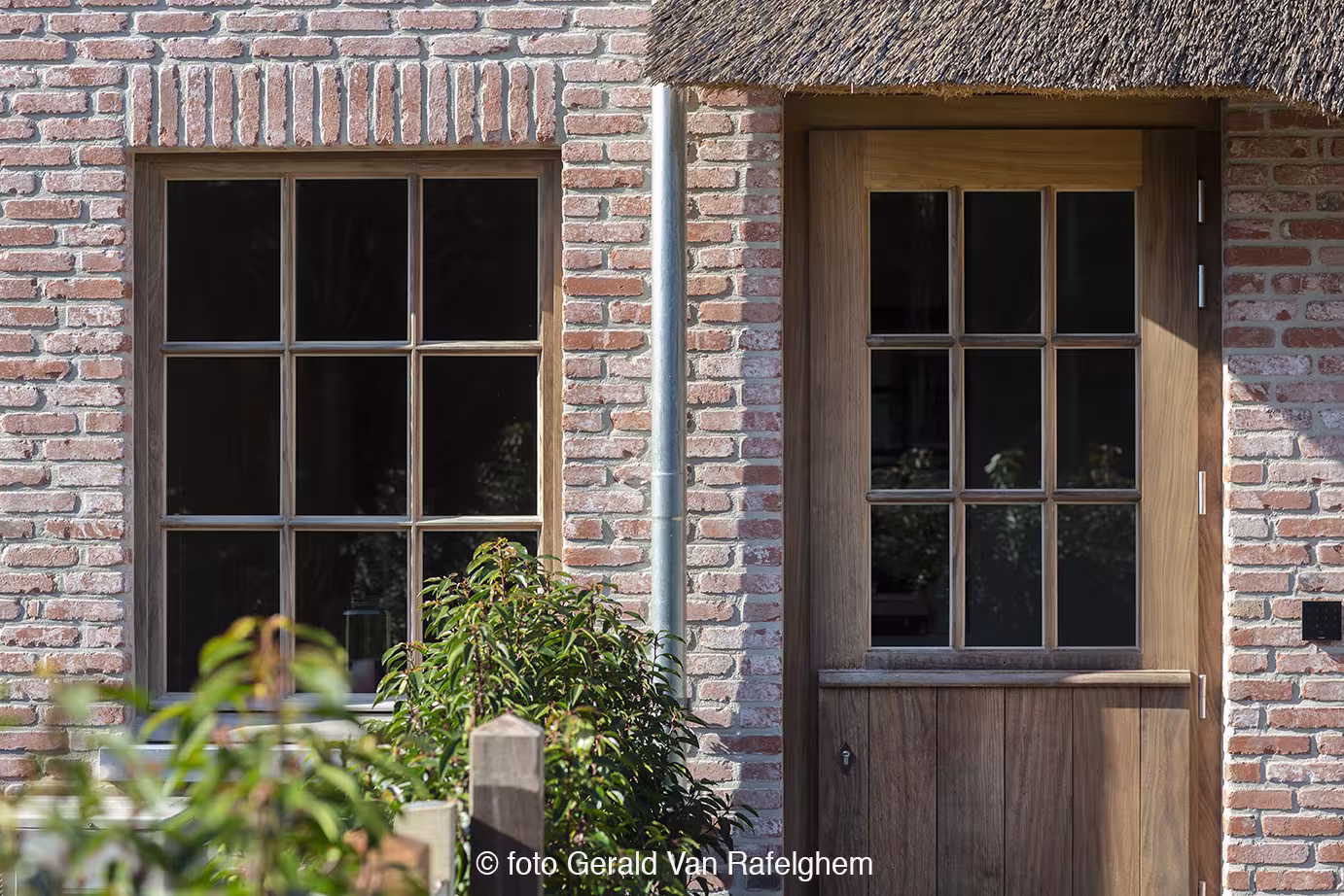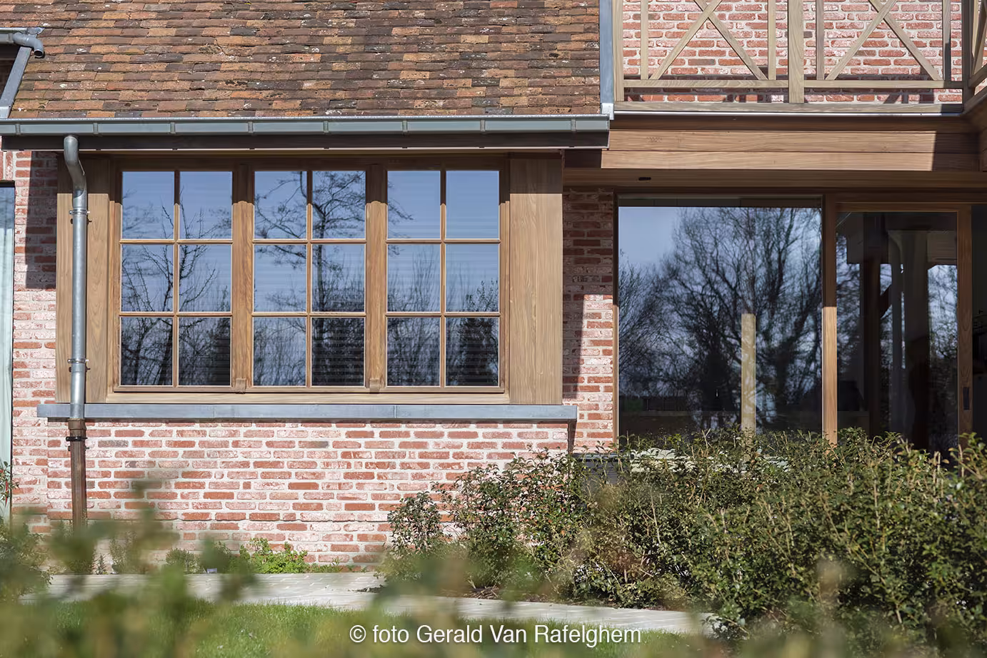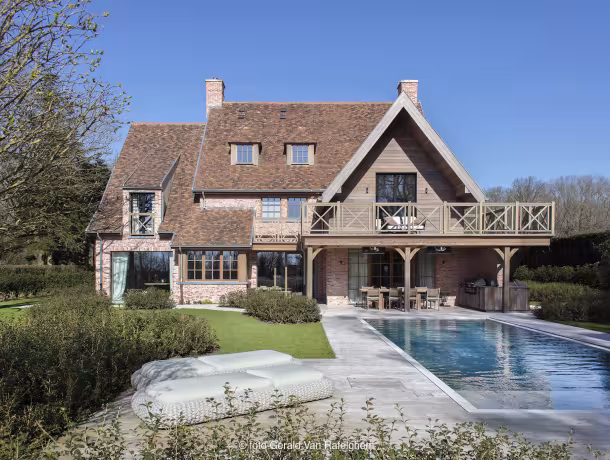 Voor deze karaktervolle villa werd het houten schrijnwerk tot in de finesse uitgewerkt. Van verfijnde raamverdelingen en royale schuiframen tot een robuuste voordeur en bijpassende luiken: elk element versterkt het landelijke karakter van de woning. Binnen en buiten vloeien naadloos in elkaar over, met een warme, natuurlijke uitstraling die rust, luxe en duurzaamheid uitstraalt. Een tijdloze realisatie waar ambacht en hedendaagse woonkwaliteit perfect samenkomen.