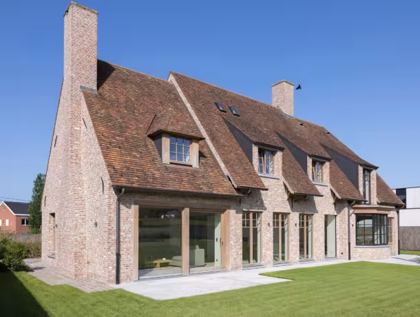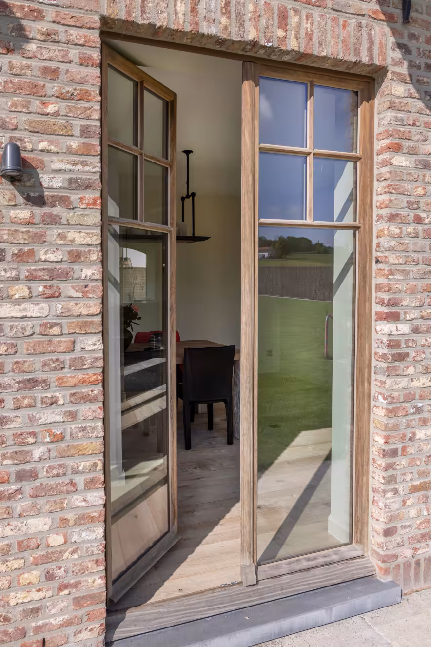 Voor deze woning werd gekozen voor houten ramen en deuren op maat, perfect afgestemd op de landelijke villabouw. De combinatie van slanke profielen, authentieke raamverdeling en hoogwaardige houtsoorten zorgt voor maximale lichtinval en een tijdloze uitstraling. Dit houten buitenschrijnwerk biedt niet alleen esthetische meerwaarde, maar ook uitstekende isolatiewaarden en een lange levensduur. Dankzij productie in eigen atelier en plaatsing door ervaren vakmensen is elk detail technisch correct uitgevoerd. Ideaal voor wie op zoek is naar houten ramen en deuren voor nieuwbouw of renovatie in het hogere segment.