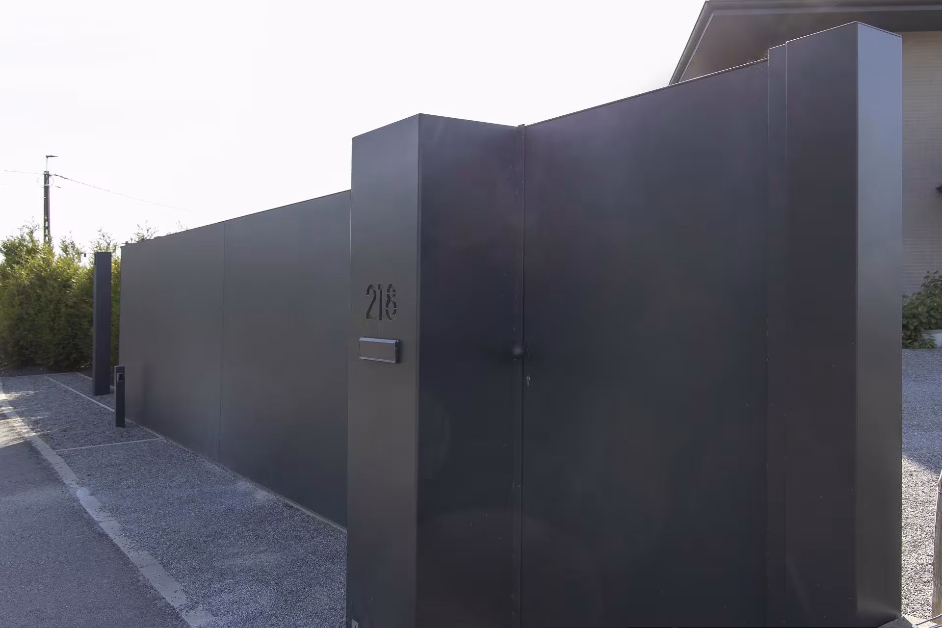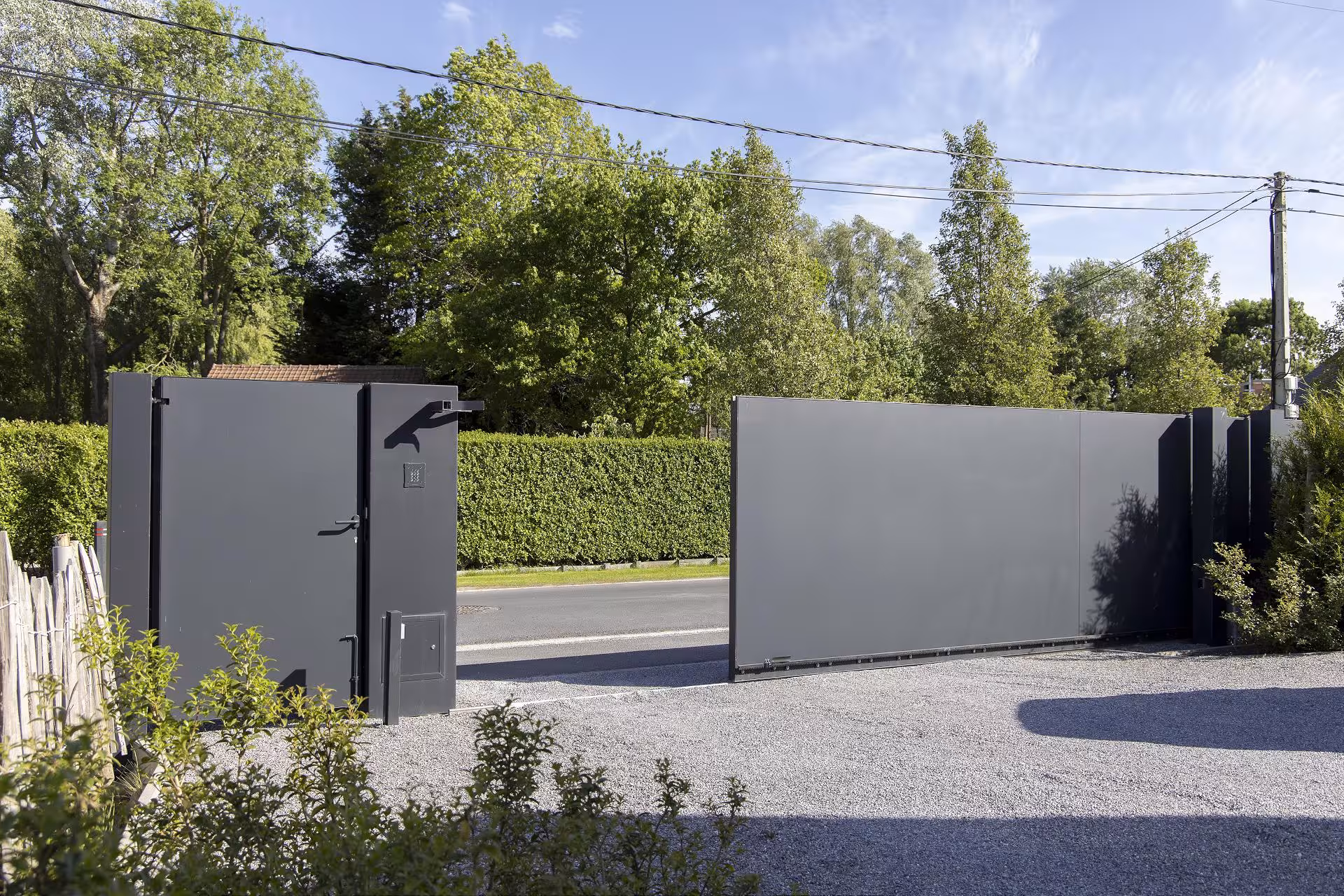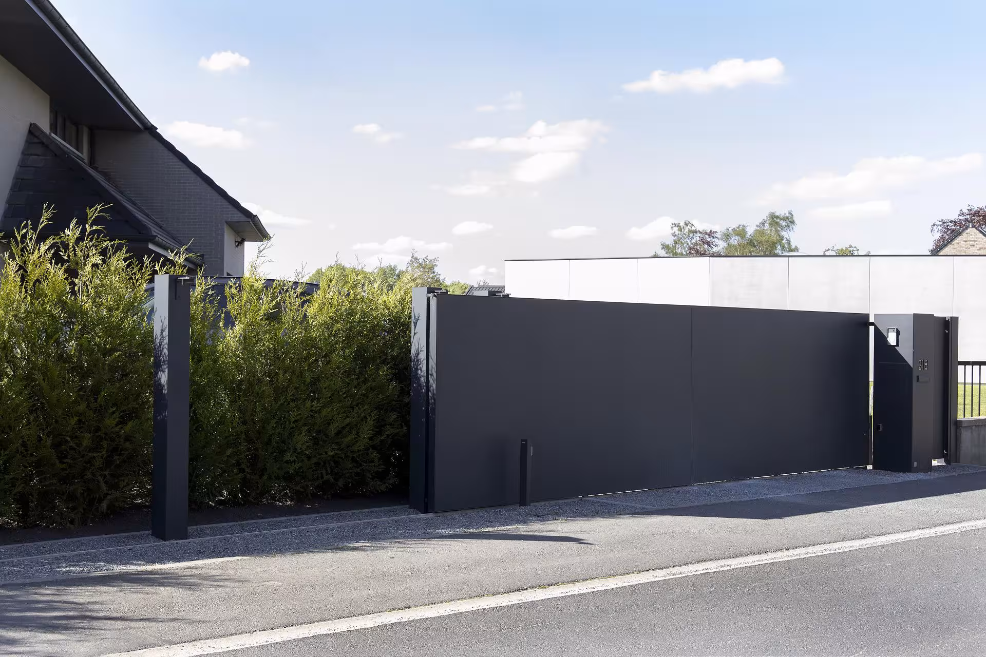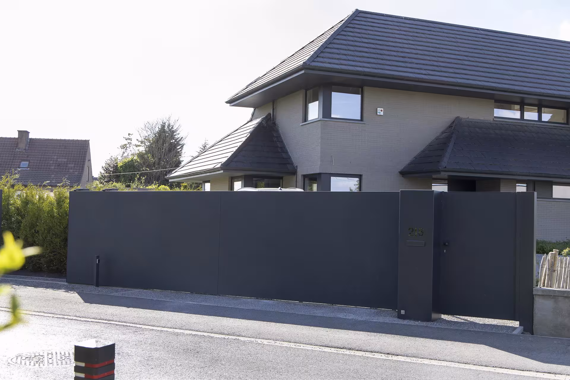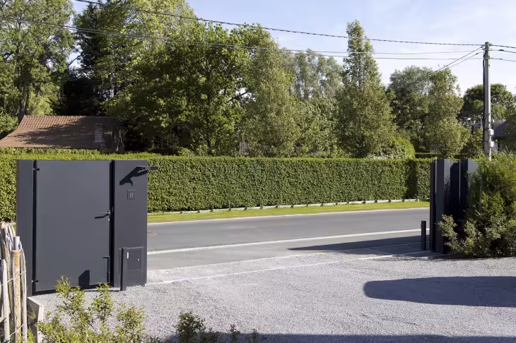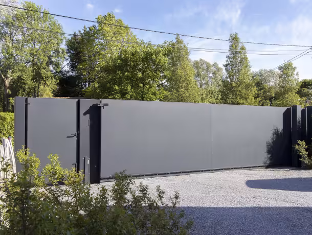 De aluminium schuifpoort werd uitgevoerd met vlakke, gesloten panelen en een matte, donkere afwerking. Dit type schuifpoort biedt volledige privacy en sluit visueel aan op de strakke volumes van de woning. De integratie van een afzonderlijke looppoort en een monolithische zuil met huisnummer en toegangscontrole zorgt voor een logisch en gebruiksvriendelijk geheel. De stijl is uitgesproken hedendaags: puur, massief en doelgericht, zonder overbodige accenten.