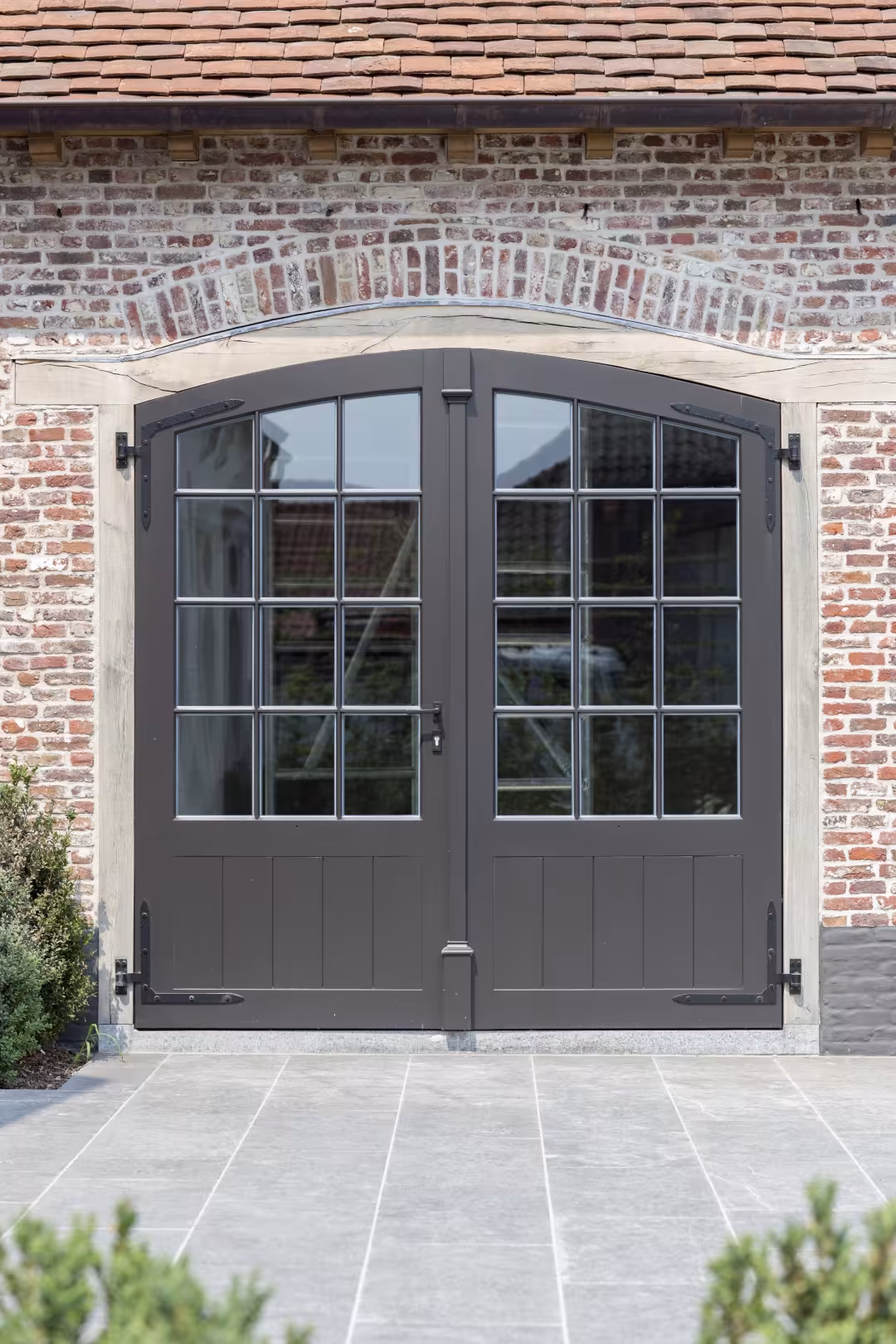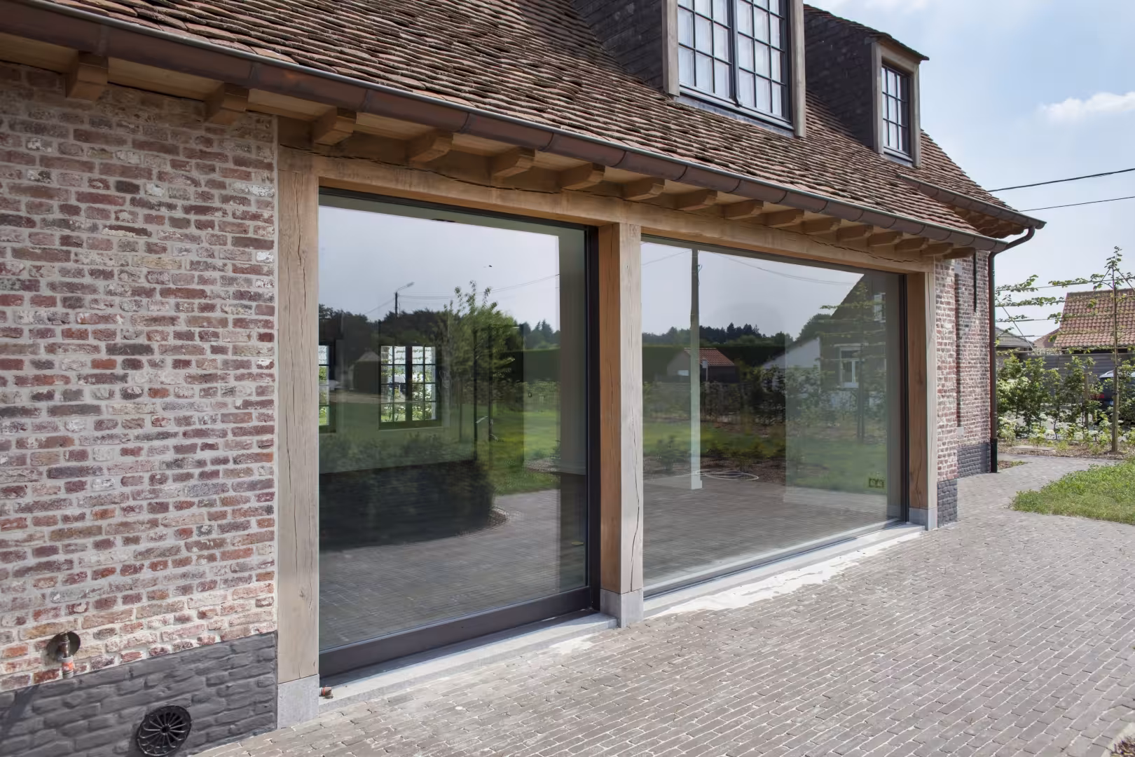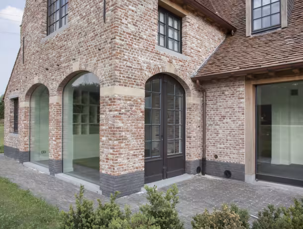 De combinatie met natuursteen accenten en baksteen creëert een sterk geheel dat zowel klassiek als hedendaags aanvoelt.