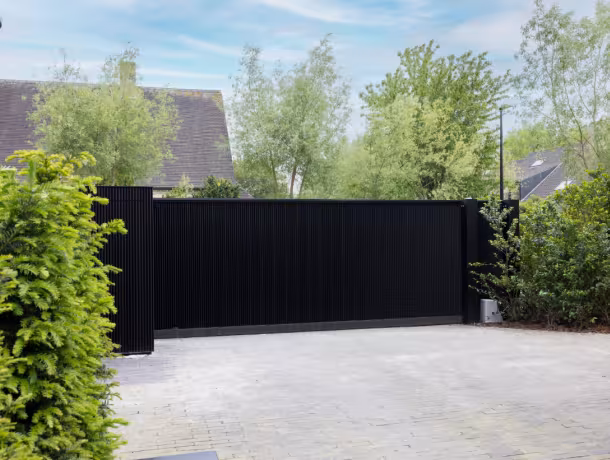 De zwarte aluminium schuifpoort werd volledig op maat ontworpen in functie van de woning en de oprit. De gesloten structuur met verticale oplegprofielen creëert een bijzonder strak en homogeen oppervlak, waardoor de poort een uitgesproken architecturale uitstraling krijgt.