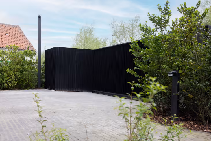 Voor deze woning realiseerde Pouleyn een zwarte aluminium schuifpoort met gesloten structuur, afgewerkt met verfijnde verticale oplegprofielen. De strakke zwarte aluminium afwerking zorgt voor een krachtige en minimalistische uitstraling die perfect aansluit bij de hedendaagse architectuur van de woning.